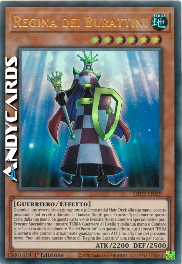 Quando il tuo avversario aggiunge uno o più mostri dal Main Deck alla sua mano, eccetto pescandoli (ed eccetto durante il Damage Step): puoi Evocare Specialmente questa carta dalla tua mano. Se questa carta viene Evocata Normalmente o Specialmente: puoi Evocare Specialmente 1 mostro TERRA Guerriero di Livello 7 dalla tua mano o Cimitero e, se hai Evocato Specialmente "Re dei Burattini" con questo effetto, tutti i mostri TERRA Guerriero che controlli attualmente guadagnano 1000 ATK fino alla fine del prossimo turno. Puoi utilizzare questo effetto di "Regina dei Burattini" una sola volta per turno.