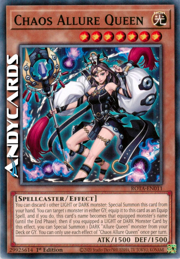 You can discard 1 other LIGHT or DARK monster; Special Summon this card from your hand. You can target 1 monster in either GY; equip it to this card as an Equip Spell, and if you do, this card's name becomes that equipped monster's name (until the End Phase), then if you equipped a LIGHT or DARK Monster Card by this effect, you can Special Summon 1 DARK "Allure Queen" monster from your Deck or GY. You can only use each effect of "Chaos Allure Queen" once per turn.