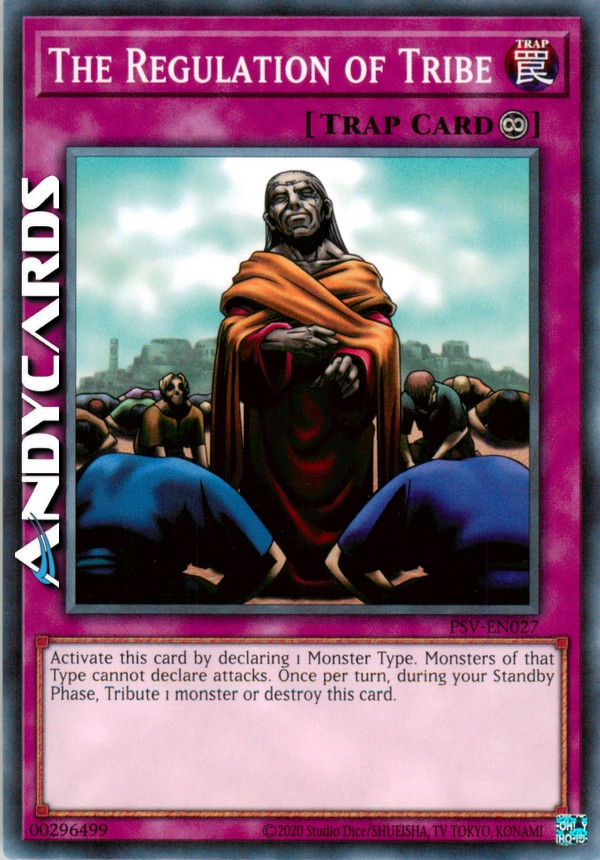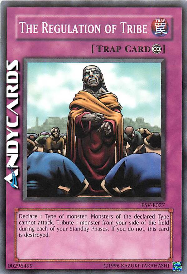 Scegli 1 Tipo di Mostro. I Mostri del Tipo selezionato non possono attaccare. Offri come Tributo 1 Mostro sul tuo Terreno in ogni tua Standby Phase. Se non lo fai, distruggi questa carta.