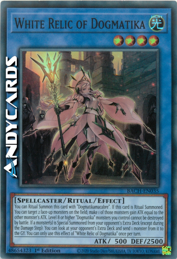 Puoi Evocare tramite Rituale questa carta con "Dogmatikamacabra". Se questa carta viene Evocata tramite Rituale: puoi scegliere come bersaglio 2 mostri scoperti sul Terreno; fai guadagnare a 1 di quei mostri ATK pari all'ATK dell'altro mostro. I mostri "Dogmatika" di Livello 8 o superiore che controlli non possono essere distrutti in battaglia. Se uno o più mostri vengono Evocati Specialmente dall'Extra Deck del tuo avversario (eccetto durante il Damage Step): puoi guardare l'Extra Deck del tuo avversario e mandare 1 mostro da esso al Cimitero. Puoi utilizzare questo effetto di "Reliquia Bianca della Dogmatika" una sola volta per turno.