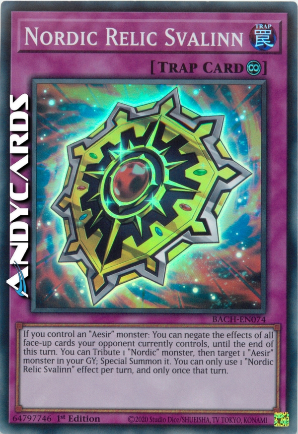 If you control an "Aesir" monster: You can negate the effects of all face-up cards your opponent currently controls, until the end of this turn. You can Tribute 1 "Nordic" monster, then target 1 "Aesir" monster in your GY; Special Summon it. You can only use 1 "Nordic Relic Svalinn" effect per turn, and only once that turn.