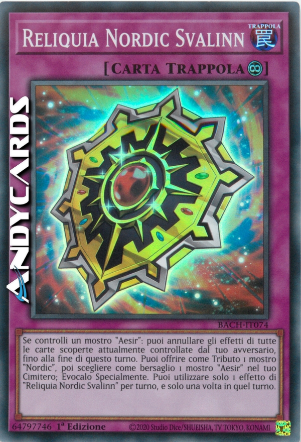 Se controlli un mostro "Aesir": puoi annullare gli effetti di tutte le carte scoperte attualmente controllate dal tuo avversario, fino alla fine di questo turno. Puoi offrire come Tributo 1 mostro "Nordic", poi scegliere come bersaglio 1 mostro "Aesir" nel tuo Cimitero; Evocalo Specialmente. Puoi utilizzare solo 1 effetto di "Reliquia Nordic Svalinn" per turno, e solo una volta in quel turno.