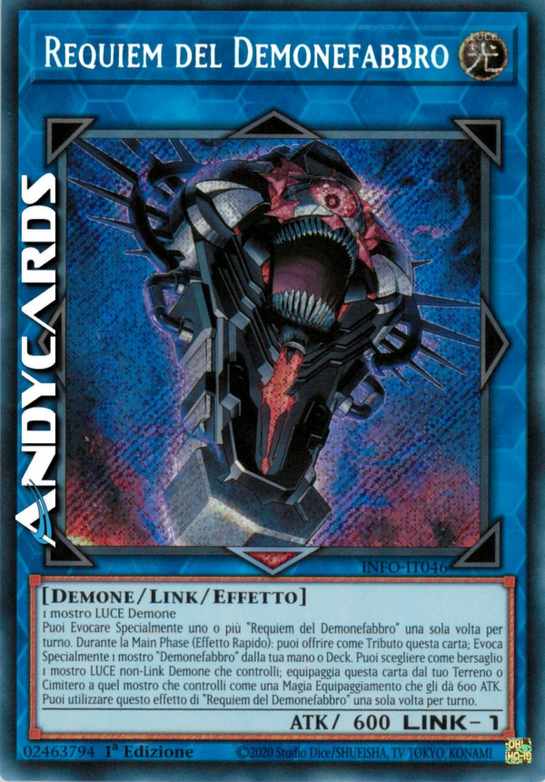 Puoi Evocare Specialmente uno o più "Requiem del Demonefabbro" una sola volta per turno. Durante la Main Phase (Effetto Rapido): puoi offrire come Tributo questa carta; Evoca Specialmente 1 mostro "Demonefabbro" dalla tua mano o Deck. Puoi scegliere come bersaglio 1 mostro LUCE non-Link Demone che controlli; equipaggia questa carta dal tuo Terreno o Cimitero a quel mostro che controlli come una Magia Equipaggiamento che gli dà 600 ATK. Puoi utilizzare questo effetto di "Requiem del Demonefabbro" una sola volta per turno.