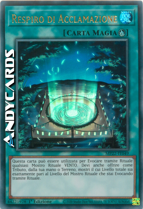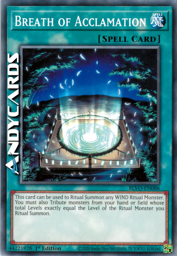 Questa carta può essere utilizzata per Evocare tramite Rituale qualsiasi Mostro Rituale VENTO. Devi anche offrire come Tributo, dalla tua mano o Terreno, mostri il cui Livello totale sia esattamente pari al Livello del Mostro Rituale che stai Evocando tramite Rituale.
