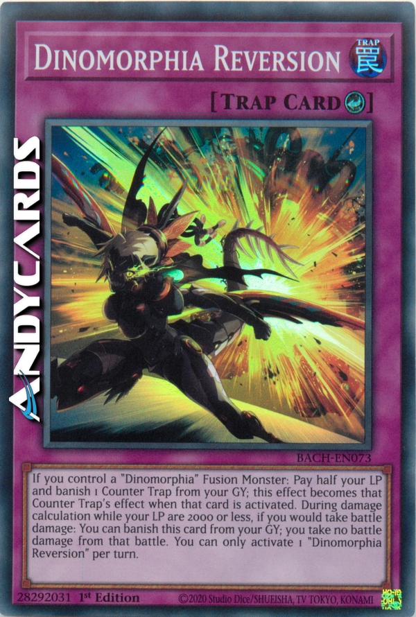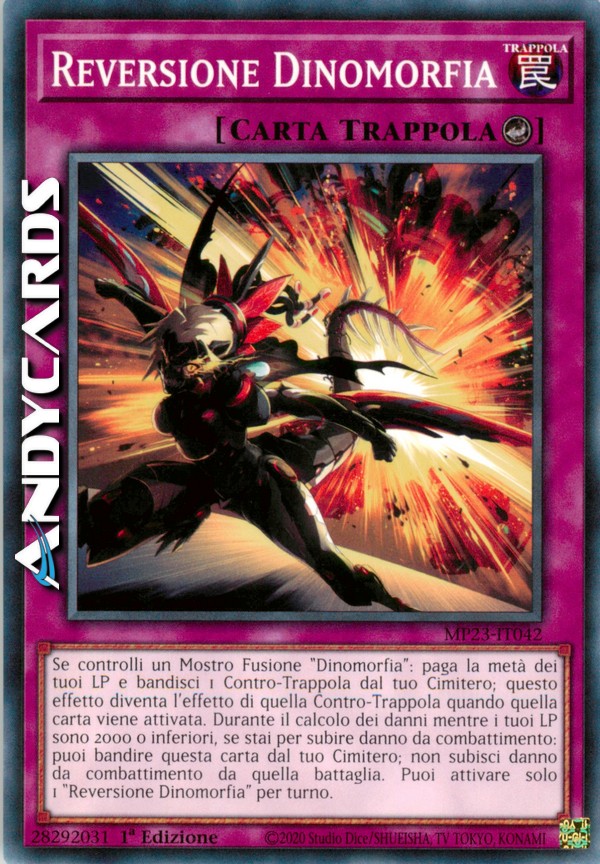 Se controlli un Mostro Fusione "Dinomorfia": paga la metà dei tuoi LP e bandisci 1 Contro-Trappola dal tuo Cimitero; questo effetto diventa l'effetto di quella Contro-Trappola quando quella carta viene attivata. Durante il calcolo dei danni mentre i tuoi LP sono 2000 o inferiori, se stai per subire danno da combattimento: puoi bandire questa carta dal tuo Cimitero; non subisci danno da combattimento da quella battaglia. Puoi attivare solo 1 "Reversione Dinomorfia" per turno.