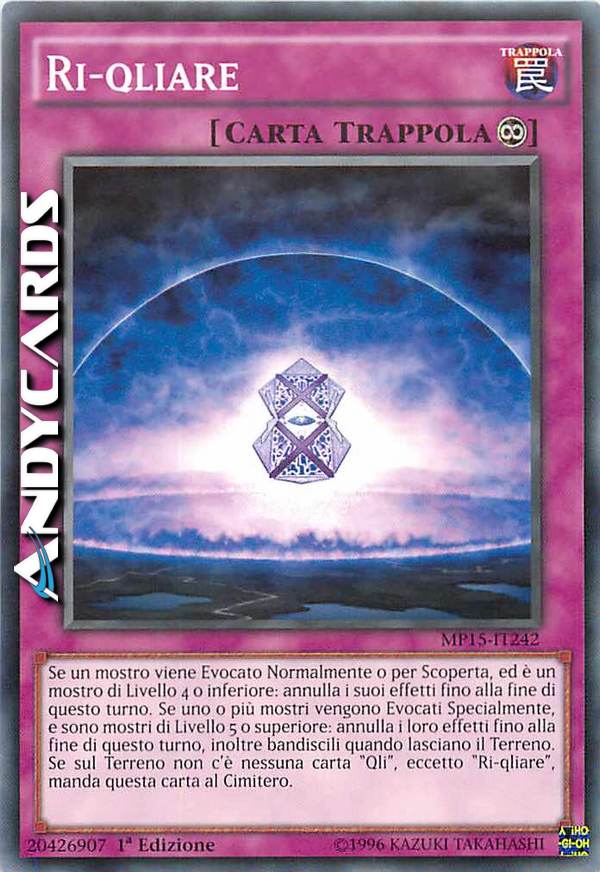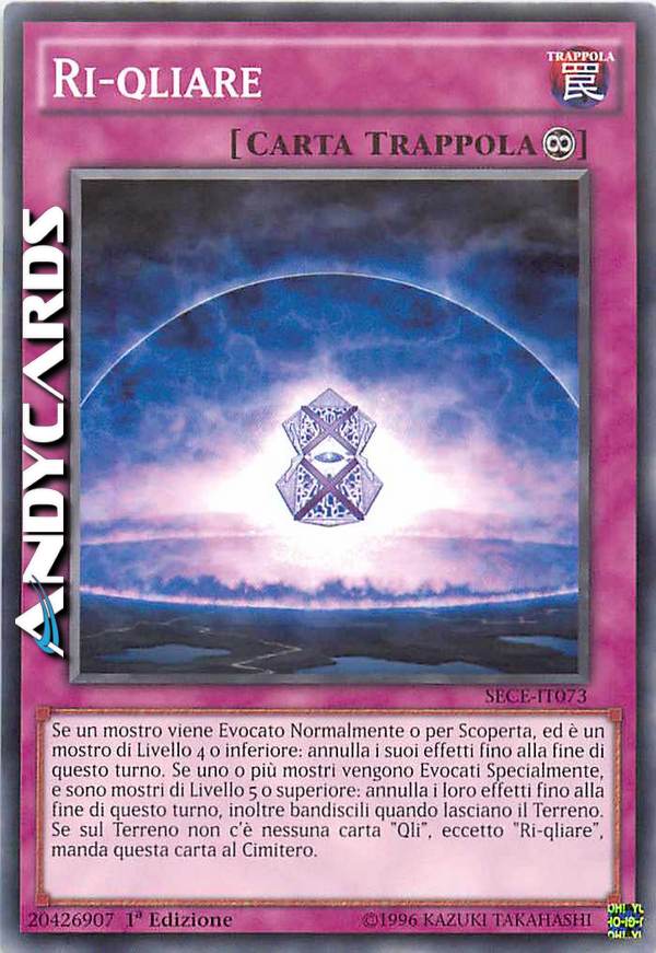 Se un mostro viene Evocato Normalmente o per Scoperta, ed è un mostro di Livello 4 o inferiore: annulla i suoi effetti fino alla fine di questo turno. Se uno o più mostri vengono Evocati Specialmente, e sono mostri di Livello 5 o superiore: annulla i loro effetti fino alla fine di questo turno, inoltre bandiscili quando lasciano il terreno. Se sul Terreno non c'è nessuna carta "Qli", eccetto "Ri-qliare", manda questa carta al cimitero.