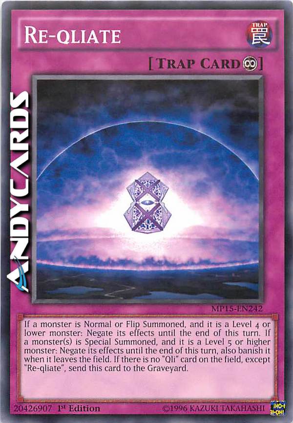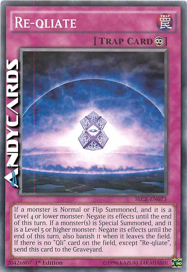 If monster is Normal or Flip Summoned, and it is a Level 4 or lower monster: Negate its effects until the end of this turn. If a monster is Special Summoned, and it is a Level 5 or higher monster: Negate its effects until the end of this turn, also banish it when it leaves the field. If there is no "Qli" card on the field, except "Re-qliate", send this card to the Graveyard.