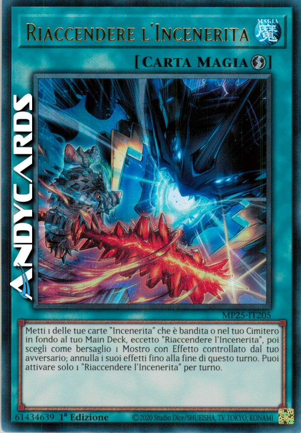 Metti 1 delle tue carte "Incenerita" che è bandita o nel tuo Cimitero in fondo al tuo Main Deck, eccetto "Riaccendere l'Incenerita", poi scegli come bersaglio 1 Mostro con Effetto controllato dal tuo avversario; annulla i suoi effetti fino alla fine di questo turno. Puoi attivare solo 1 "Riaccendere l'Incenerita" per turno.