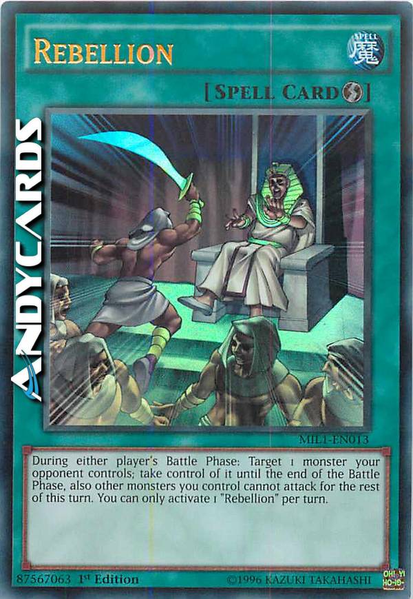 During either player's Battle Phase: Target 1 monster your opponent controls; take control of it until the end of the Battle Phase, also other monsters you control cannot attack for the rest of this turn. You can only activate 1 "Rebellion" per turn.