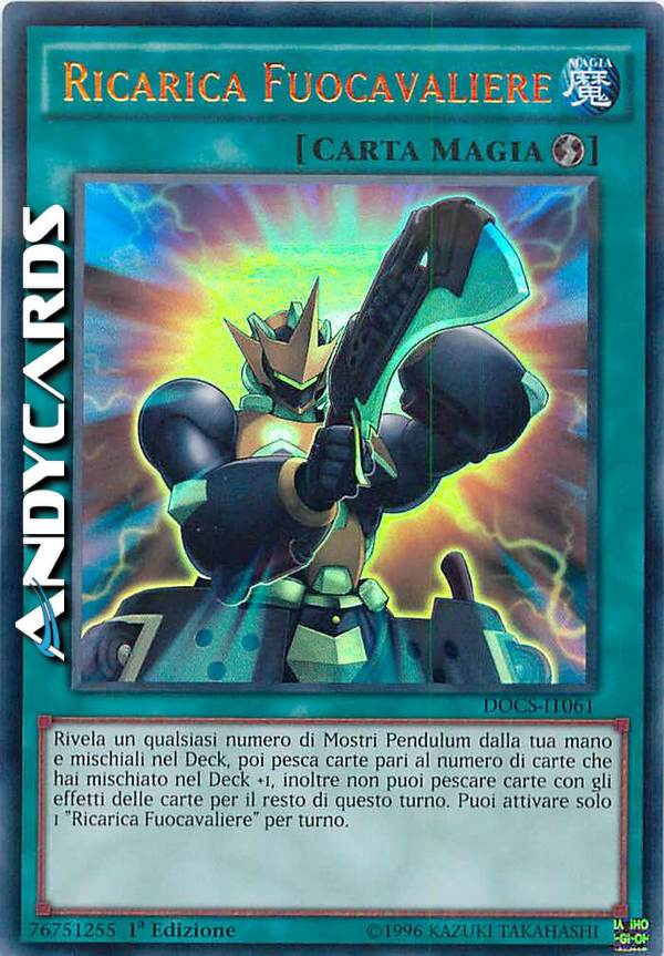 Rivela un qualsiasi numero di Mostri Pendulum dalla tua mano e mischiali nel Deck, poi pesca carte pari al numero di carte che hai mischiato nel Deck +1, inoltre non puoi pescare carte con gli effetti delle carte per il resto di questo turno. Puoi attivare solo 1 "Ricarica Fuocavaliere" per turno.