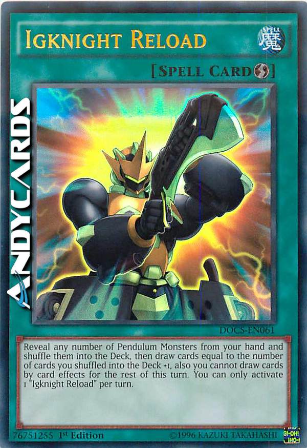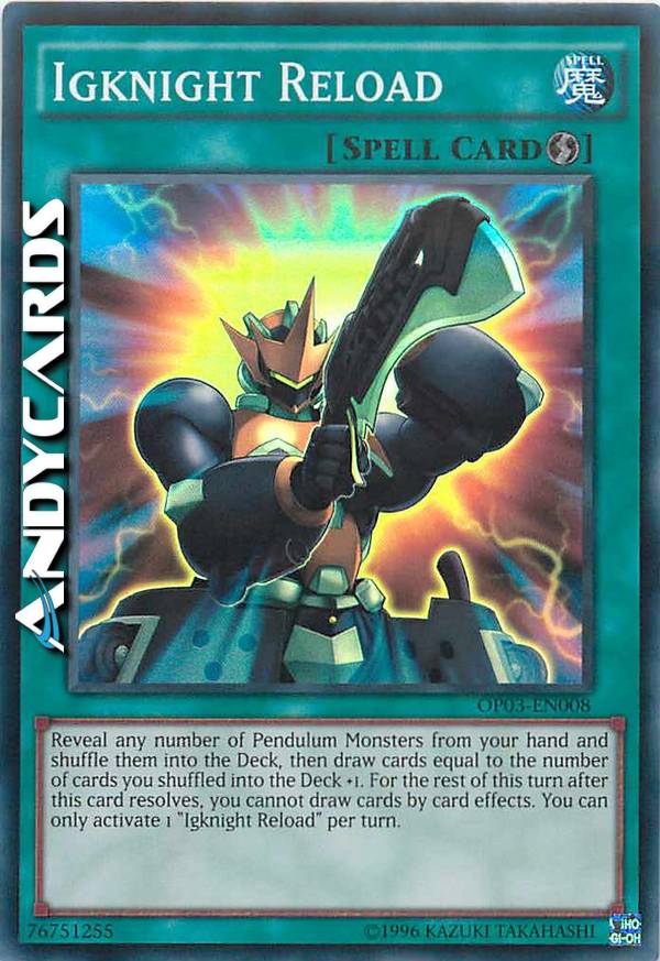 Reveal any number of Pendulum Monsters from your hand and shuffle them into the Deck, then draw cards equal to the number of cards you shuffled into the Deck +1, also you cannot draw cards by card effects for the rest of this turn. You can only activate 1 "Igknight Reload" per turn.
