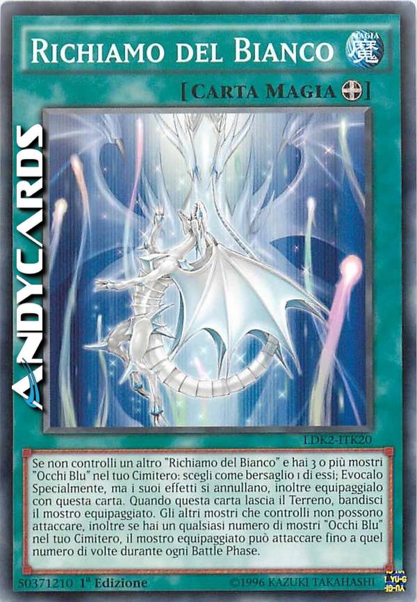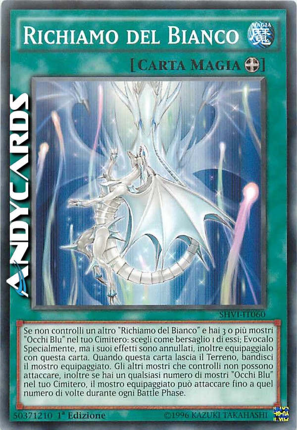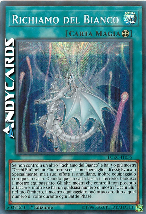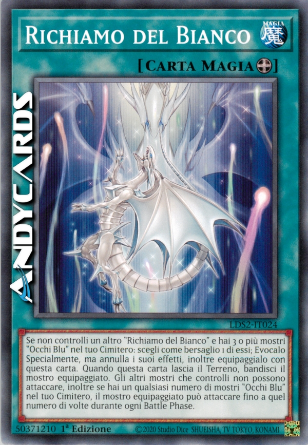 Se non controlli un altro "Richiamo del Bianco" e hai 3 o più mostri "Occhi Blu" nel tuo Cimitero: scegli come bersaglio 1 di essi; Evocalo Specialmente, ma i suoi effetti si annullano, inoltre equipaggialo con questa carta. Quando questa carta lascia il Terreno, bandisci il mostro equipaggiato. Gli altri mostri che controlli non possono attaccare, inoltre se hai un qualsiasi numero di mostri "Occhi Blu" nel tuo Cimitero, il mostro equipaggiato può attaccare fino a quel numero di volte durante ogni Battle Phase.