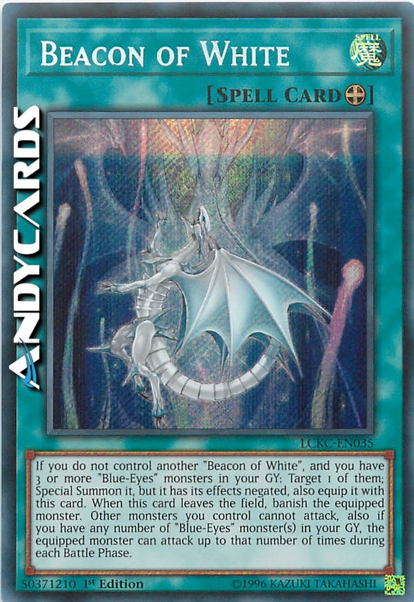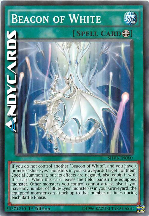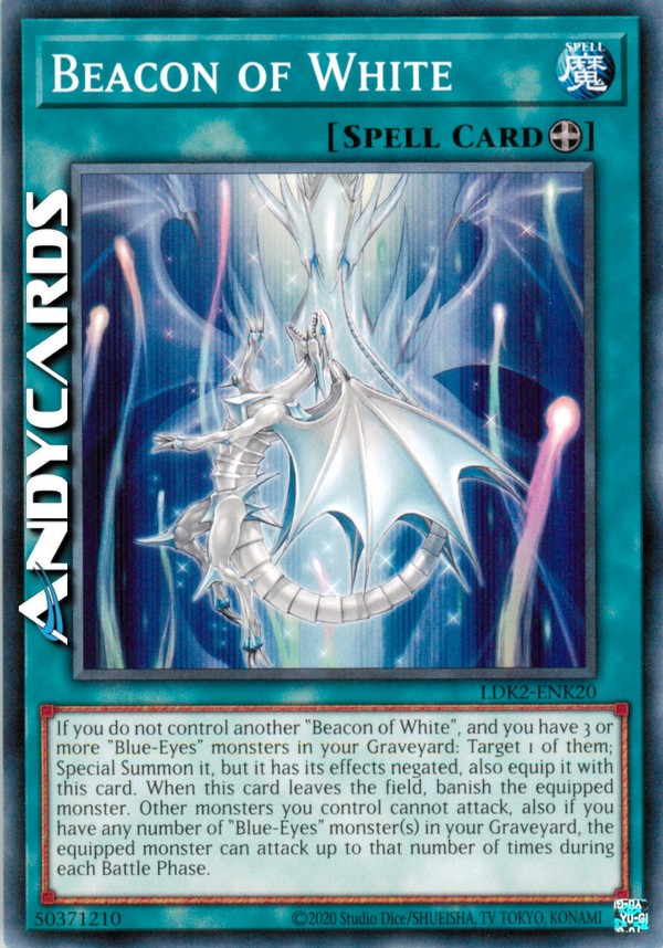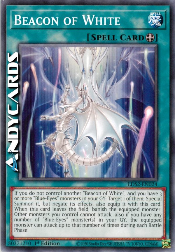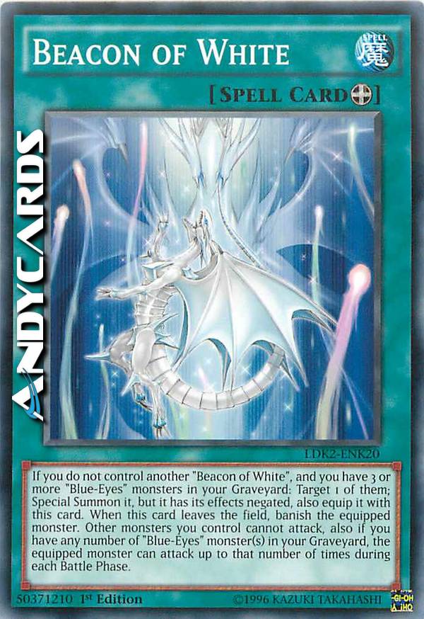 If you do not control another "Beacon of White", and you have 3 or more "Blue-Eyes" monsters in your GY: Target 1 of them; Special Summon it, but negate its effects, also equip it with this card. When this card leaves the field, banish the equipped monster. Other monsters you control cannot attack, also if you have any number of "Blue-Eyes" monster(s) in your GY, the equipped monster can attack up to that number of times during each Battle Phase.