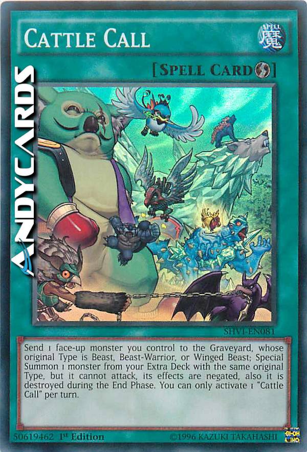 Send 1 face-up monster you control to the GY, whose original Type is Beast, Beast-Warrior, or Winged Beast; Special Summon 1 monster from your Extra Deck with the same original Type, but it cannot attack, its effects are negated, also it is destroyed during the End Phase. You can only activate 1 "Cattle Call" per turn.