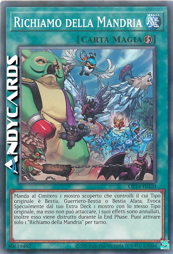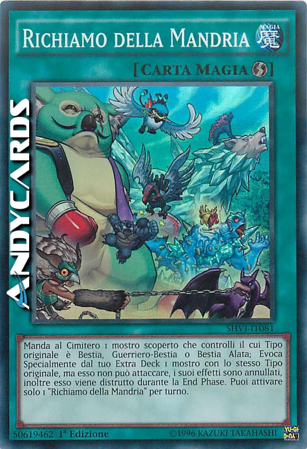 Manda al Cimitero 1 mostro scoperto che controlli il cui Tipo originale è Bestia, Guerriero-Bestia o Bestia Alata; Evoca Specialmente dal tuo Extra Deck 1 mostro con lo stesso Tipo originale, ma esso non può attaccare, i suoi effetti sono annullati, inoltre esso viene distrutto durante la End Phase. Puoi attivare solo 1 "Richiamo della Mandria" per turno.
