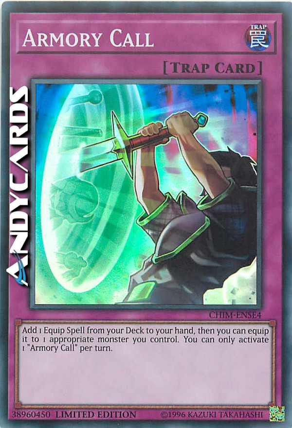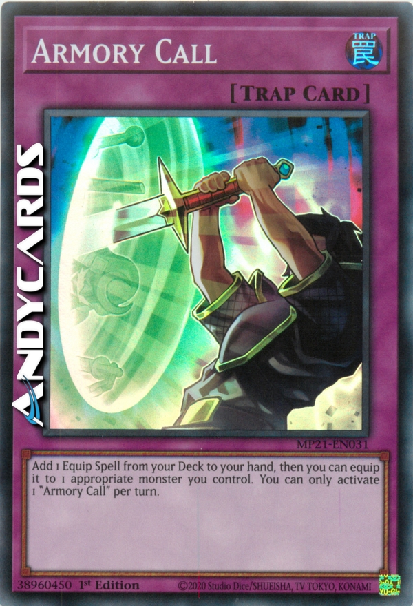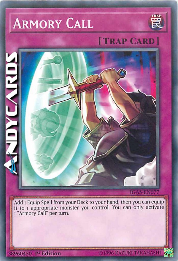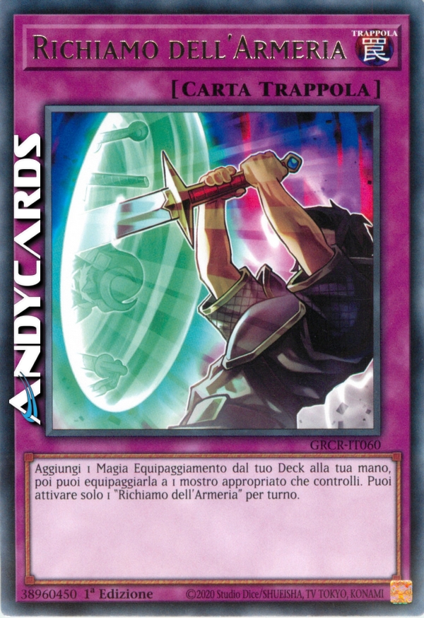 Aggiungi 1 Magia Equipaggiamento dal tuo Deck alla tua mano, poi puoi equipaggiarla a 1 mostro appropriato che controlli. Puoi attivare solo 1 "Richiamo dell'Armeria" per turno.
