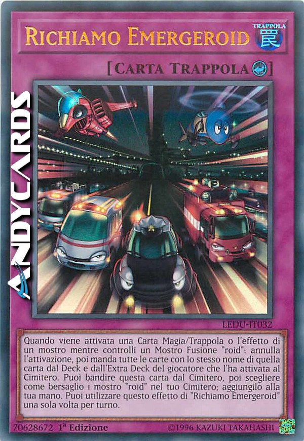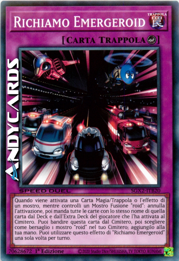 Quando viene attivata una Carta Magia/Trappola o l'effetto di un mostro, mentre controlli un Mostro Fusione "roid": annulla l'attivazione, poi manda tutte le carte con lo stesso nome di quella carta dal Deck e dall'Extra Deck del giocatore che l'ha attivata al Cimitero. Puoi bandire questa carta dal Cimitero, poi scegliere come bersaglio 1 mostro "roid" nel tuo Cimitero; aggiungilo alla tua mano. Puoi utilizzare questo effetto di "Richiamo Emergeroid" una sola volta per turno.