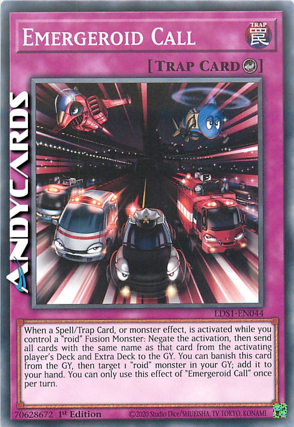 When a Spell/Trap Card, or monster effect, is activated while you control a "roid" Fusion Monster: Negate the activation, then send all cards with the same name as that card from the activating player's Deck and Extra Deck to the GY. You can banish this card from the GY, then target 1 "roid" monster in your GY; add it to your hand. You can only use this effect of "Emergeroid Call" once per turn.