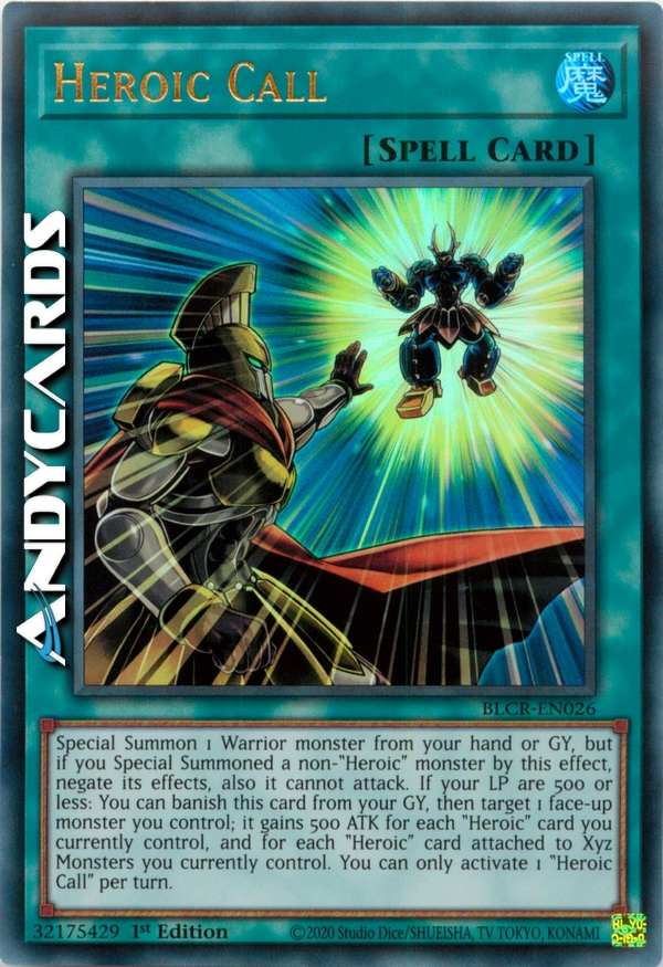 Special Summon 1 Warrior monster from your hand or GY, but if you Special Summoned a non-"Heroic" monster by this effect, negate its effects, also it cannot attack. If your LP are 500 or less: You can banish this card from your GY, then target 1 face-up monster you control; it gains 500 ATK for each "Heroic" card you currently control, and for each "Heroic" card attached to Xyz Monsters you currently control. You can only activate 1 "Heroic Call" per turn.