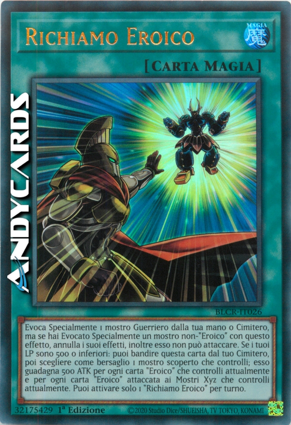 Evoca Specialmente 1 mostro Guerriero dalla tua mano o Cimitero, ma se hai Evocato Specialmente un mostro non-"Eroico" con questo effetto, annulla i suoi effetti, inoltre esso non può attaccare. Se i tuoi LP sono 500 o inferiori: puoi bandire questa carta dal tuo Cimitero, poi scegliere come bersaglio 1 mostro scoperto che controlli; esso guadagna 500 ATK per ogni carta "Eroico" che controlli attualmente e per ogni carta "Eroico" attaccata ai Mostri Xyz che controlli attualmente. Puoi attivare solo 1 "Richiamo Eroico" per turno.