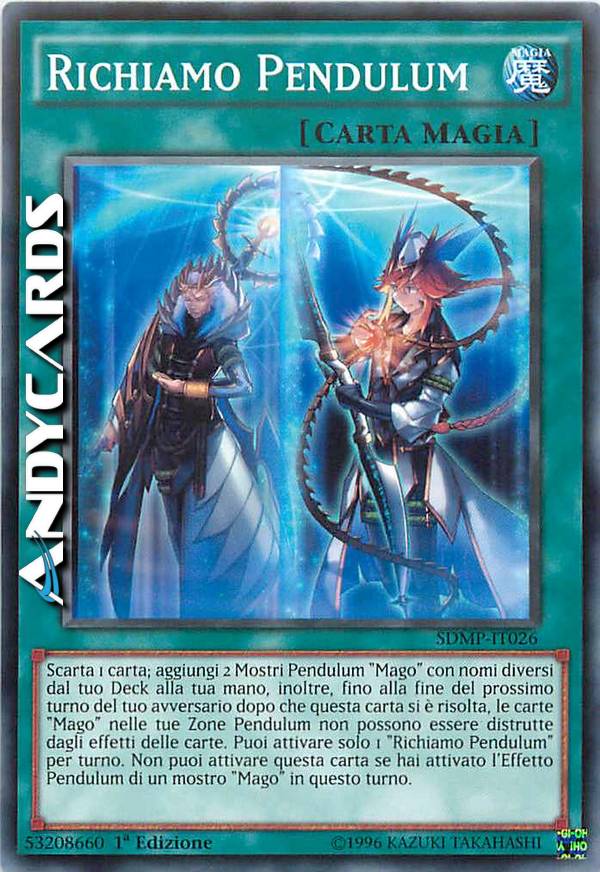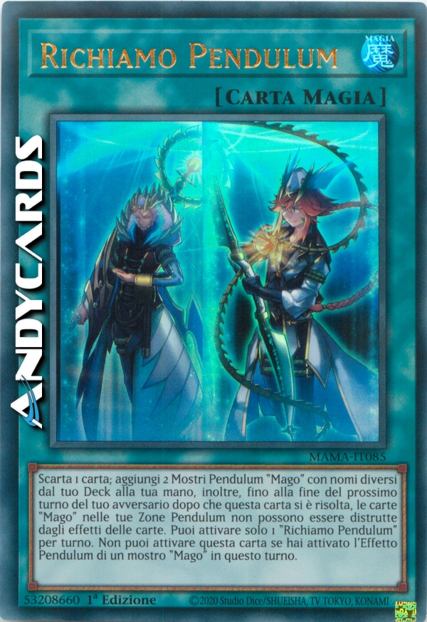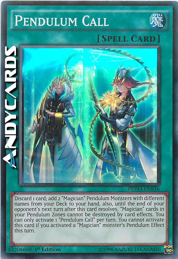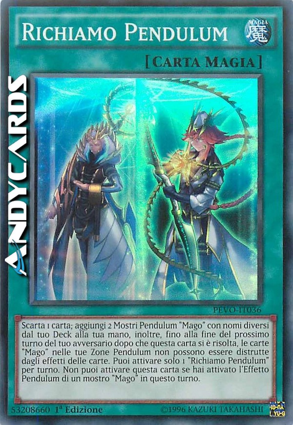 Scarta 1 carta; aggiungi 2 Mostri Pendulum "Mago" con nomi diversi dal tuo Deck alla tua mano, inoltre, fino alla fine del prossimo turno del tuo avversario dopo che questa carta si è risolta, le carte "Mago" nelle tue Zone Pendulum non possono essere distrutte dagli effetti delle carte. Puoi attivare solo 1 "Richiamo Pendulum" per turno. Non puoi attivare questa carta se hai attivato l'Effetto Pendulum di un mostro "Mago" in questo turno.
