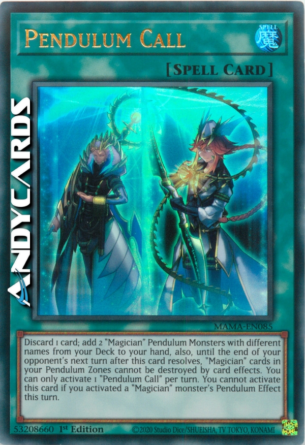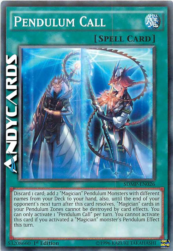 Discard 1 card; add 2 "Magician" Pendulum Monsters with different names from your Deck to your hand, also, until the end of your opponent's next turn after this card resolves, "Magician" cards in your Pendulum Zones cannot be destroyed by card effects. You can only activate 1 "Pendulum Call" per turn. You cannot activate this card if you activated a "Magician" monster's Pendulum Effect this turn.