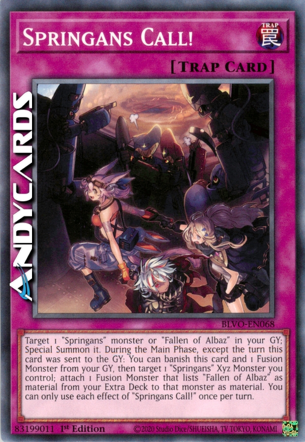Scegli come bersaglio 1 mostro "Springans" o "Caduto di Albaz" nel tuo Cimitero; Evocalo Specialmente. Durante la Main Phase, eccetto nel turno in cui questa carta è stata mandata al Cimitero: puoi bandire questa carta e 1 Mostro Fusione dal tuo Cimitero, poi scegliere come bersaglio 1 Mostro Xyz "Springans" che controlli; attacca 1 Mostro Fusione che indica "Caduto di Albaz" come materiale dal tuo Extra Deck a quel mostro come materiale. Puoi utilizzare ogni effetto di "Richiamo Springans!" una sola volta per turno.