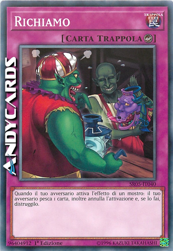 Quando il tuo avversario attiva l'effetto di un mostro: il tuo avversario pesca 1 carta, inoltre annulla l'attivazione e, se lo fai, distruggilo.