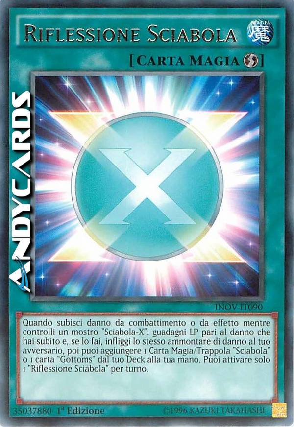 Quando subisci danno da combattimento o da effetto mentre controlli un mostro "Sciabola-X": guadagni LP pari al danno che hai subito e, se lo fai, infliggi lo stesso ammontare di danno al tuo avversario, poi puoi aggiungere 1 Carta Magia/Trappola "Sciabola" o 1 carta "Gottoms" dal tuo Deck alla tua mano. Puoi attivare solo 1 "Riflessione Sciabola" per turno.
