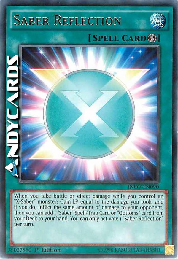 When you take battle or effect damage while you control an "X-Saber" monster: Gain LP equal to the damage you took, and if you do, inflict the same amount of damage to your opponent, then you can add 1 "Saber" Spell/Trap Card or "Gottoms" card from your Deck to your hand. You can only activate 1 "Saber Reflection" per turn.