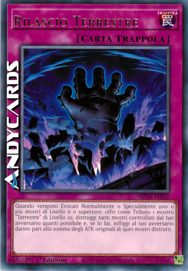 Quando vengono Evocati Normalmente o Specialmente uno o più mostri di Livello 6 o superiore: offri come Tributo 1 mostro "Terrestre" di Livello 10; distruggi tanti mostri controllati dal tuo avversario quanti possibile e, se lo fai, infliggi al tuo avversario danno pari alla somma degli ATK originali di quei mostri distrutti.