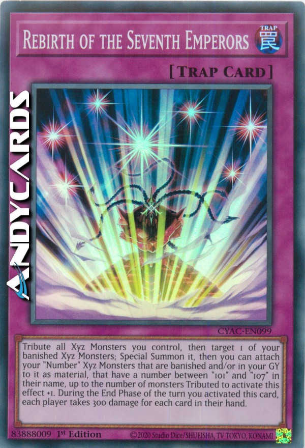 Offri come Tributo tutti i Mostri Xyz che controlli, poi scegli come bersaglio 1 tuo Mostro Xyz bandito; Evocalo Specialmente, poi puoi attaccare a esso come materiale i tuoi Mostri Xyz "Numero" che sono banditi e/o nel tuo Cimitero, che hanno un numero tra "101" e "107" nel loro nome, fino al numero di mostri offerti come Tributo per attivare questo effetto +1. Durante la End Phase del turno in cui hai attivato questa carta, ogni giocatore subisce 300 danni per ogni carta nella sua mano.