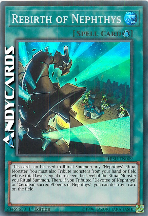 This card can be used to Ritual Summon any "Nephthys" Ritual Monster. You must also Tribute monsters from your hand or field whose total Levels equal or exceed the Level of the Ritual Monster you Ritual Summon. Then, if you Tributed "Devotee of Nephthys" or "Cerulean Sacred Phoenix of Nephthys", you can destroy 1 card on the field.