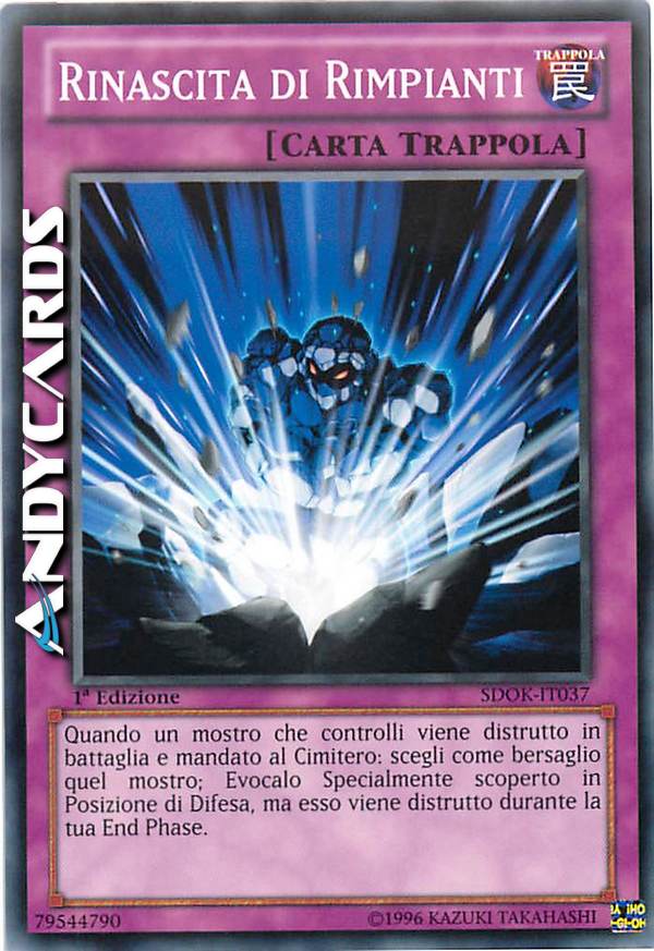 Quando un mostro che controlli viene distrutto in battaglia e mandato al Cimitero: scegli come bersaglio quel mostro; Evocalo Specialmente scoperto in Posizione di Difesa, ma esso viene distrutto durante la tua End Phase.