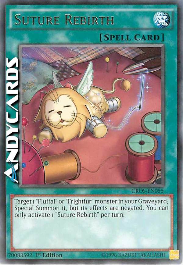 Scegli come bersaglio 1 mostro "Fluffal" o "Pellicciaspavento" nel tuo Cimitero; Evocalo Specialmente, ma i suoi effetti sono annullati. Puoi attivare solo 1 "Rinascita Sutura" per turno.