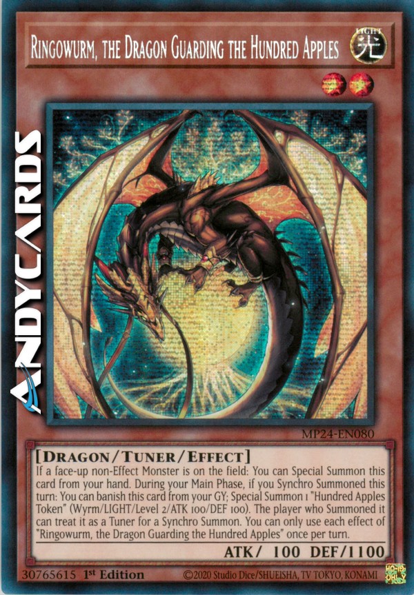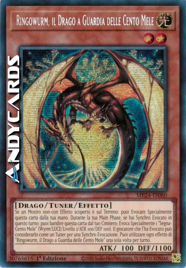 Se un Mostro non-con Effetto scoperto è sul Terreno: puoi Evocare Specialmente questa carta dalla tua mano. Durante la tua Main Phase, se hai Synchro Evocato in questo turno: puoi bandire questa carta dal tuo Cimitero; Evoca Specialmente 1 "Segna-Cento Mele" (Wyrm/LUCE/Livello 2/ATK 100/DEF 100). Il giocatore che l'ha Evocato può considerarlo come un Tuner per una Synchro Evocazione. Puoi utilizzare ogni effetto di "Ringowurm, il Drago a Guardia delle Cento Mele" una sola volta per turno.