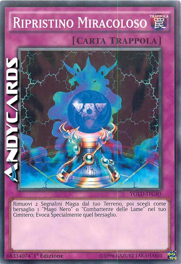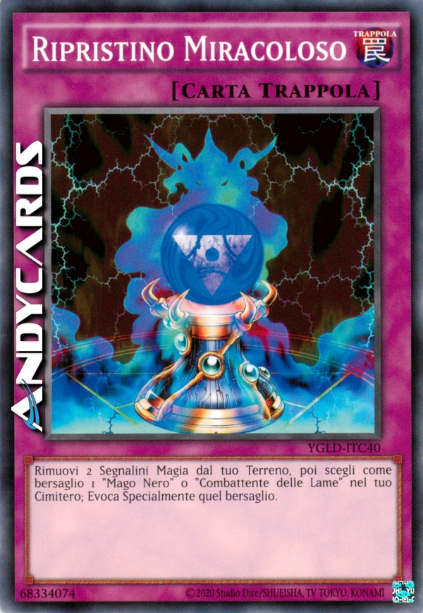 Rimuovi 2 Segnalini Magia dal tuo Terreno. Evocare tramite Evocazione Speciale 1 "Mago Nero" o "Combattente delle Lame" dal tuo Cimitero.