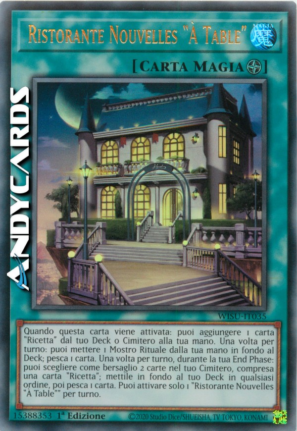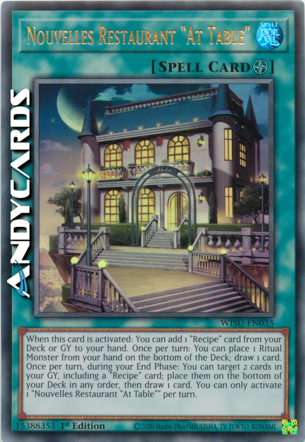 Quando questa carta viene attivata: puoi aggiungere 1 carta "Ricetta" dal tuo Deck o Cimitero alla tua mano. Una volta per turno: puoi mettere 1 Mostro Rituale dalla tua mano in fondo al Deck; pesca 1 carta. Una volta per turno, durante la tua End Phase: puoi scegliere come bersaglio 2 carte nel tuo Cimitero, compresa una carta "Ricetta"; mettile in fondo al tuo Deck in qualsiasi ordine, poi pesca 1 carta. Puoi attivare solo 1 "Ristorante Nouvelles "À Table"" per turno.