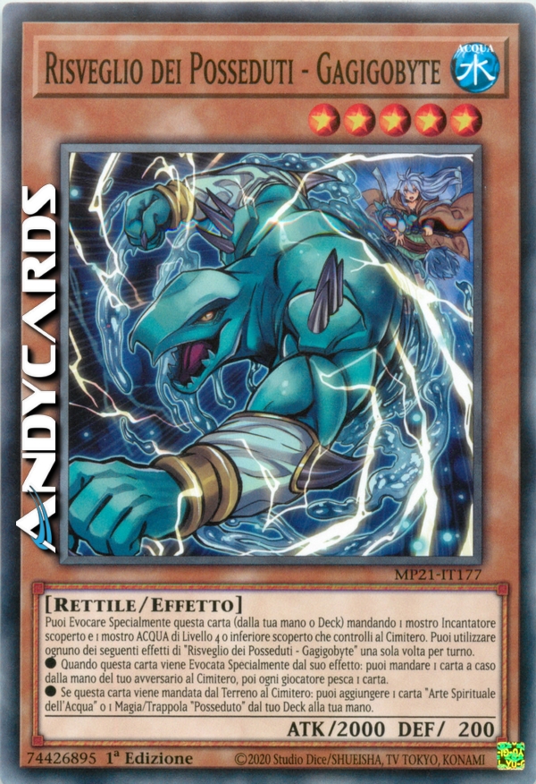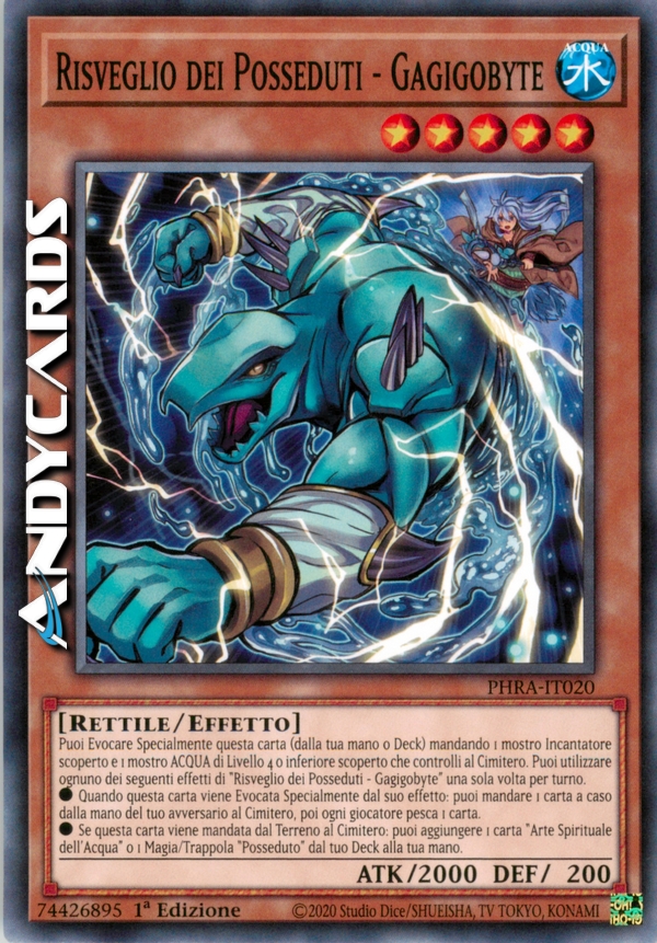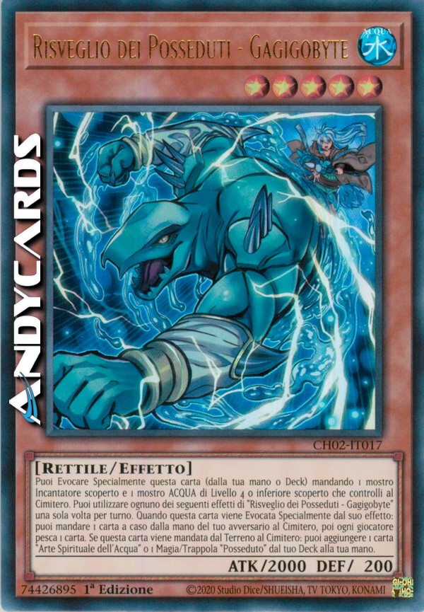 Puoi Evocare Specialmente questa carta (dalla tua mano o Deck) mandando 1 mostro Incantatore scoperto e 1 mostro ACQUA di Livello 4 o inferiore scoperto che controlli al Cimitero. Puoi utilizzare ognuno dei seguenti effetti di "Risveglio dei Posseduti - Gagigobyte" una sola volta per turno.