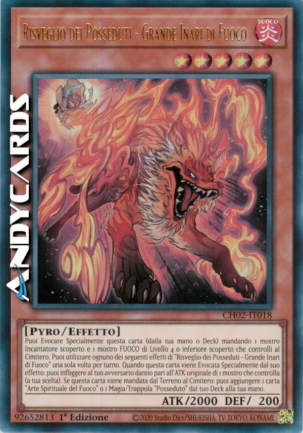 Puoi Evocare Specialmente questa carta (dalla tua mano o Deck) mandando 1 mostro Incantatore scoperto e 1 mostro FUOCO di Livello 4 o inferiore scoperto che controlli al Cimitero. Puoi utilizzare ognuno dei seguenti effetti di "Risveglio dei Posseduti - Grande Inari di Fuoco" una sola volta per turno. Quando questa carta viene Evocata Specialmente dal suo effetto: puoi infliggere al tuo avversario danno pari all'ATK originale di 1 mostro che controlla (a tua scelta). Se questa carta viene mandata dal Terreno al Cimitero: puoi aggiungere 1 carta "Arte Spirituale del Fuoco" o 1 Magia/Trappola "Posseduto" dal tuo Deck alla tua mano.