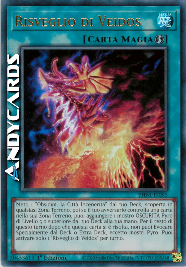 Metti 1 "Obsidim, la Città Incenerita" dal tuo Deck, scoperta in qualsiasi Zona Terreno, poi se il tuo avversario controlla una carta nella sua Zona Terreno, puoi aggiungere 1 mostro OSCURITÀ Pyro di Livello 5 o superiore dal tuo Deck alla tua mano. Per il resto di questo turno dopo che questa carta si è risolta, non puoi Evocare Specialmente dal Deck o Extra Deck, eccetto mostri Pyro. Puoi attivare solo 1 "Risveglio di Veidos" per turno.