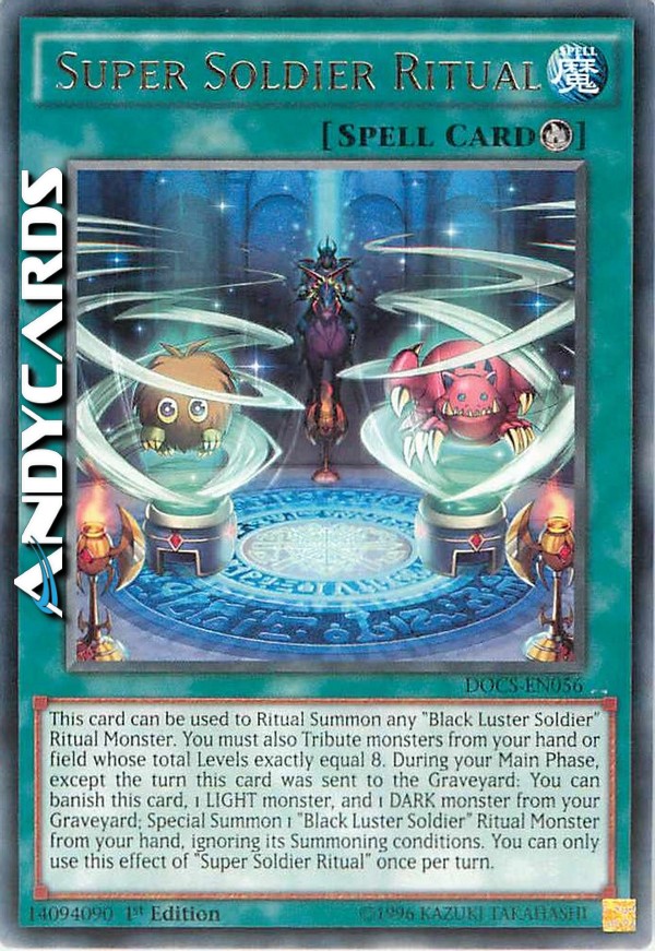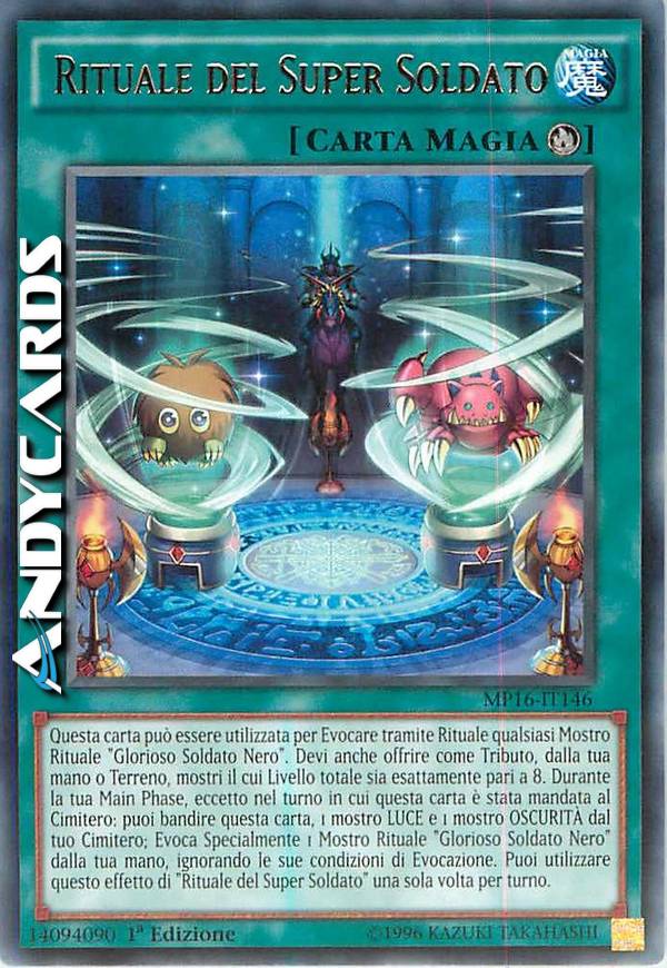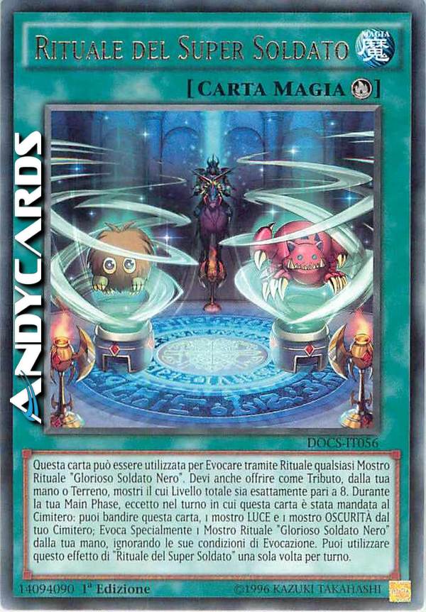 Questa carta può essere utilizzata per Evocare tramite Rituale qualsiasi Mostro Rituale "Glorioso Soldato Nero". Devi anche offrire come Tributo mostri dalla tua mano o Terreno con Livello totale esattamente pari a 8. Durante la tua Main Phase, eccetto nel turno in cui questa carta è stata mandata al Cimitero: puoi bandire questa carta, 1 mostro LUCE e 1 mostro OSCURITÀ dal tuo Cimitero; Evoca Specialmente 1 Mostro Rituale "Glorioso Soldato Nero" dalla tua mano, ignorando le sue condizioni di Evocazione. Puoi utilizzare questo effetto di "Rituale del Super Soldato" una sola volta per turno.