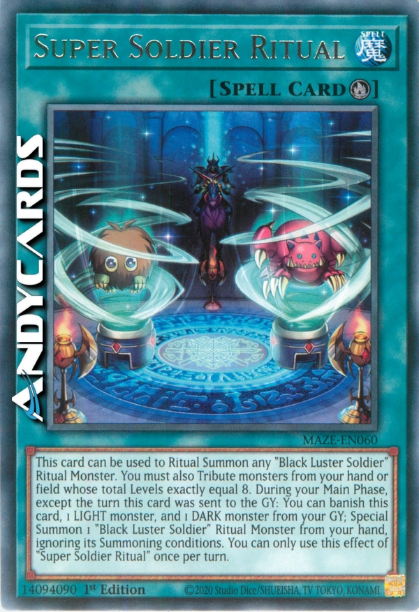 This card can be used to Ritual Summon any "Black Luster Soldier" Ritual Monster. You must also Tribute monsters from your hand or field whose total Levels exactly equal 8. During your Main Phase, except the turn this card was sent to the GY: You can banish this card, 1 LIGHT monster, and 1 DARK monster from your GY; Special Summon 1 "Black Luster Soldier" Ritual Monster from your hand, ignoring its Summoning conditions. You can only use this effect of "Super Soldier Ritual" once per turn.