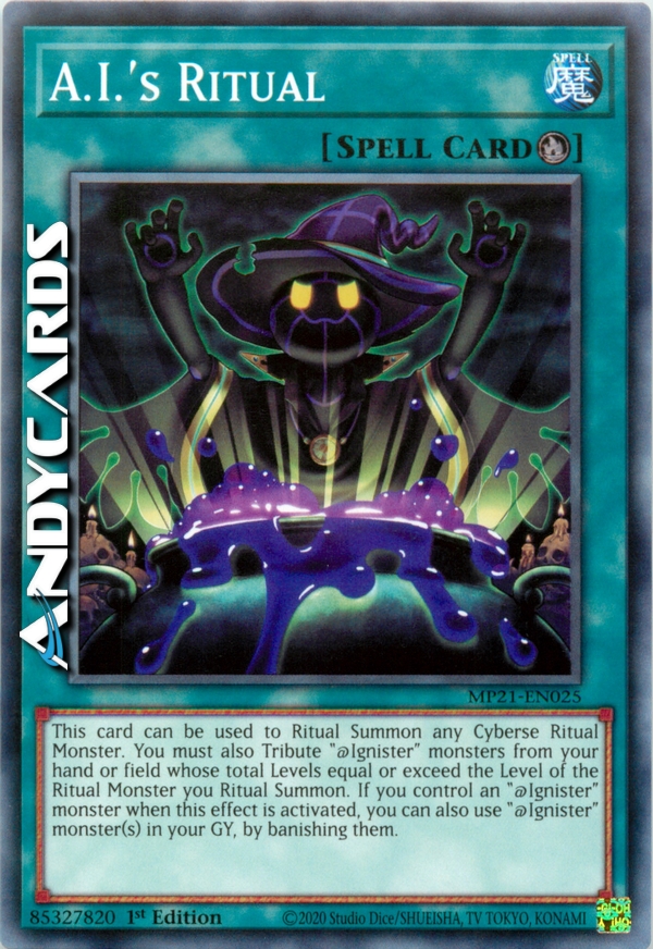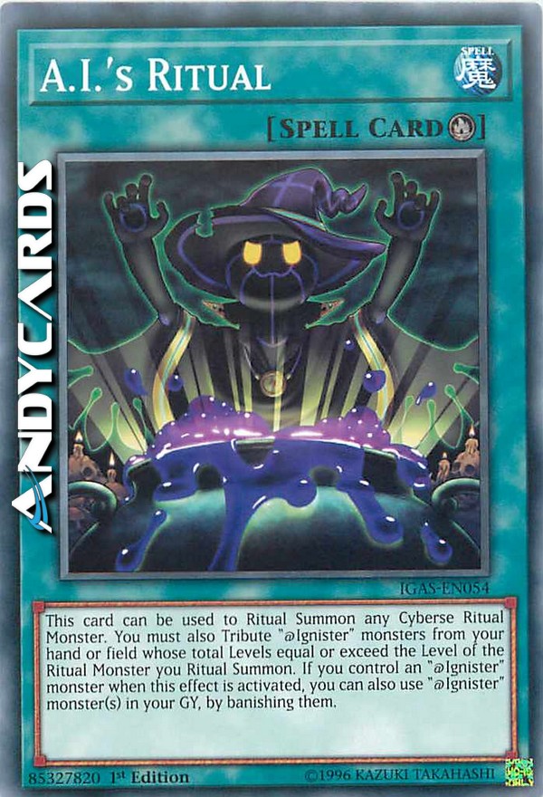 This card can be used to Ritual Summon any Cyberse Ritual Monster. You must also Tribute "@Ignister" monsters from your hand or field whose total Levels equal or exceed the Level of the Ritual Monster you Ritual Summon. If you control an "@Ignister" monster when this effect is activated, you can also use "@Ignister" monster(s) in your GY, by banishing them.