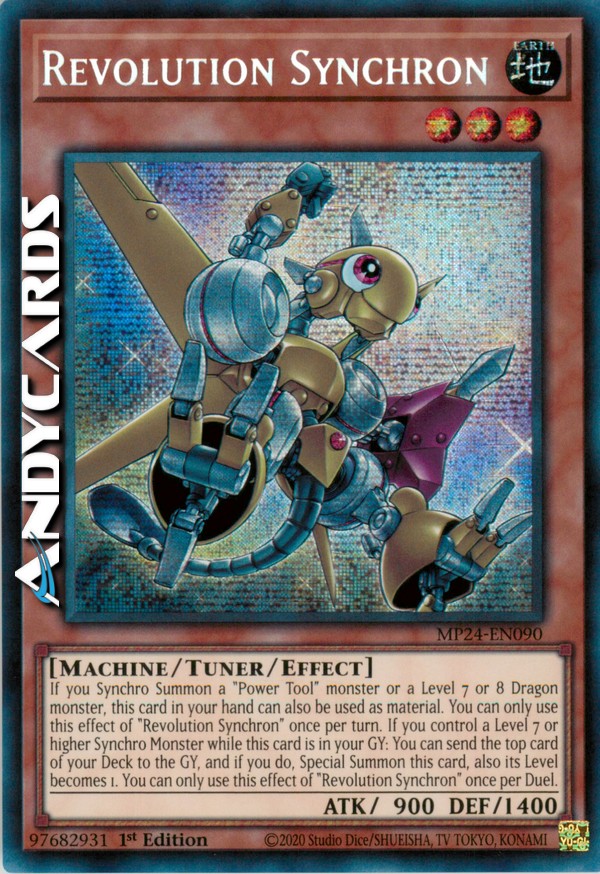If you Synchro Summon a "Power Tool" monster or a Level 7 or 8 Dragon monster, this card in your hand can also be used as material. You can only use this effect of "Revolution Synchron" once per turn. If you control a Level 7 or higher Synchro Monster while this card is in your GY: You can send the top card of your Deck to the GY, and if you do, Special Summon this card, also its Level becomes 1. You can only use this effect of "Revolution Synchron" once per Duel.