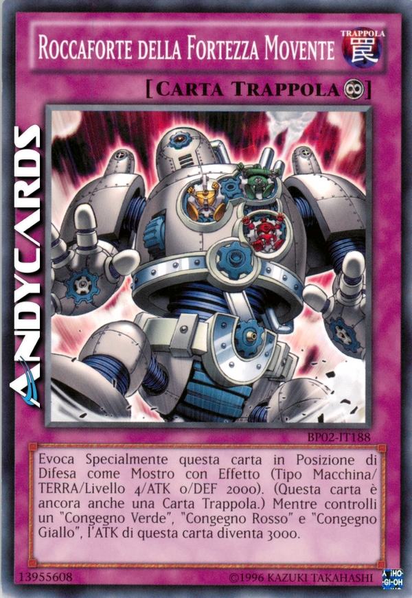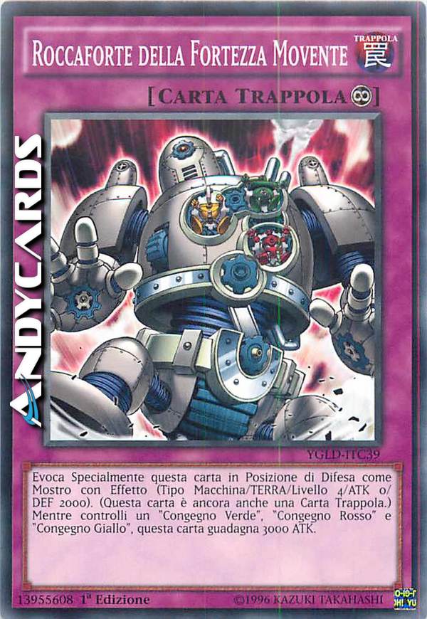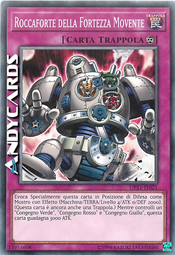 Evoca Specialmente questa carta in Posizione di Difesa come Mostro con Effetto (Tipo Macchina/TERRA/Livello 4/ATK 0/DEF 2000). (Questa carta è ancora anche una Carta Trappola.) Mentre controlli un "Congegno Verde", "Congegno Rosso" e "Congegno Giallo", questa carta guadagna 3000 ATK.