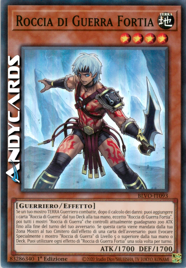 Se un tuo mostro TERRA Guerriero combatte, dopo il calcolo dei danni: puoi aggiungere 1 carta "Roccia di Guerra" dal tuo Deck alla tua mano, eccetto "Roccia di Guerra Fortia", poi tutti i mostri "Roccia di Guerra" che controlli attualmente guadagnano 200 ATK fino alla fine del turno del tuo avversario. Se questa carta viene mandata dalla tua Zona Mostri al tuo Cimitero dall'effetto di una carta dell'avversario: puoi Evocare Specialmente 1 mostro "Roccia di Guerra" di Livello 5 o superiore dalla tua mano o Deck. Puoi utilizzare ogni effetto di "Roccia di Guerra Fortia" una sola volta per turno.