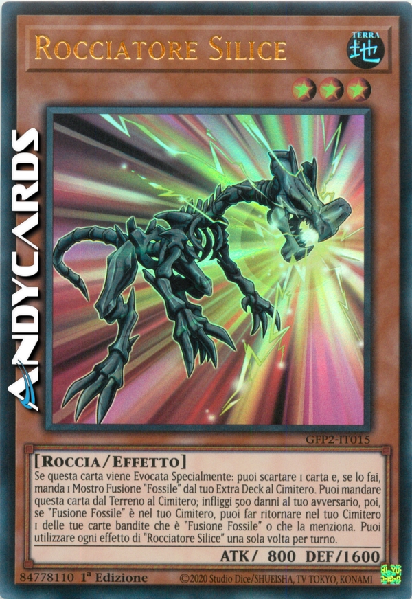 Se questa carta viene Evocata Specialmente: puoi scartare 1 carta e, se lo fai, manda 1 Mostro Fusione "Fossile" dal tuo Extra Deck al Cimitero. Puoi mandare questa carta dal Terreno al Cimitero; infliggi 500 danni al tuo avversario, poi, se "Fusione Fossile" è nel tuo Cimitero, puoi far ritornare nel tuo Cimitero 1 delle tue carte bandite che è "Fusione Fossile" o che la menziona. Puoi utilizzare ogni effetto di "Rocciatore Silice" una sola volta per turno.