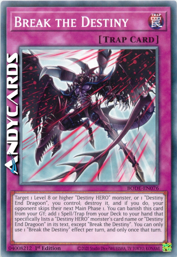Target 1 Level 8 or higher "Destiny HERO" monster, or 1 "Destiny End Dragoon", you control; destroy it, and if you do, your opponent skips their next Main Phase 1. You can banish this card from your GY; add 1 Spell/Trap from your Deck to your hand that specifically lists a "Destiny HERO" monster's card name or "Destiny End Dragoon" in its text, except "Break the Destiny". You can only use 1 "Break the Destiny" effect per turn, and only once that turn.