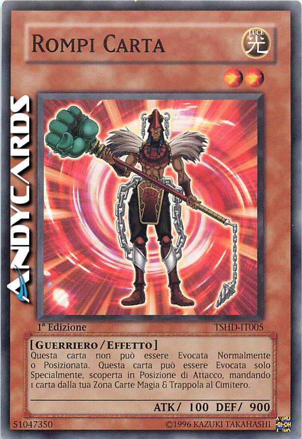 Questa carta non può essere Evocata Normalmente o Posizionata. Questa carta può essere Evocata solo Specialmente, scoperta in Posizione di Attacco, mandando 1 carta dalla tua Zona Carte Magia & Trappola al Cimitero.